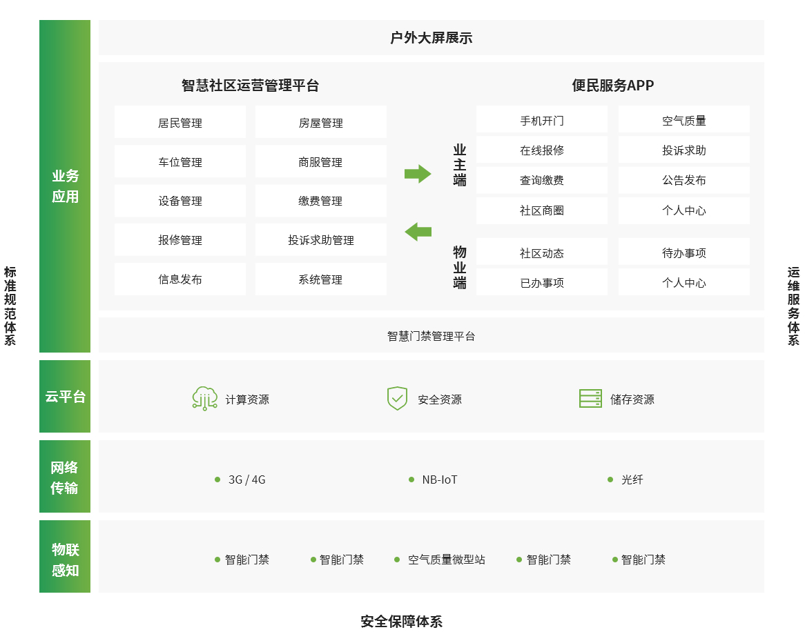 本項目采用先進、開放、標準、主流、成熟的基礎(chǔ)平臺、開發(fā)手段與信息技術(shù)規(guī)范,滿足智慧社區(qū)對平臺建設(shè)先進性、開放性、標準化、穩(wěn)定性、可擴展性的需要。按照公共安全、物業(yè)管理和便民服務(wù)的基本功能需求,共包括物聯(lián)感知層、網(wǎng)絡(luò)傳輸層、云平臺層、業(yè)務(wù)應(yīng)用層四個層次。
